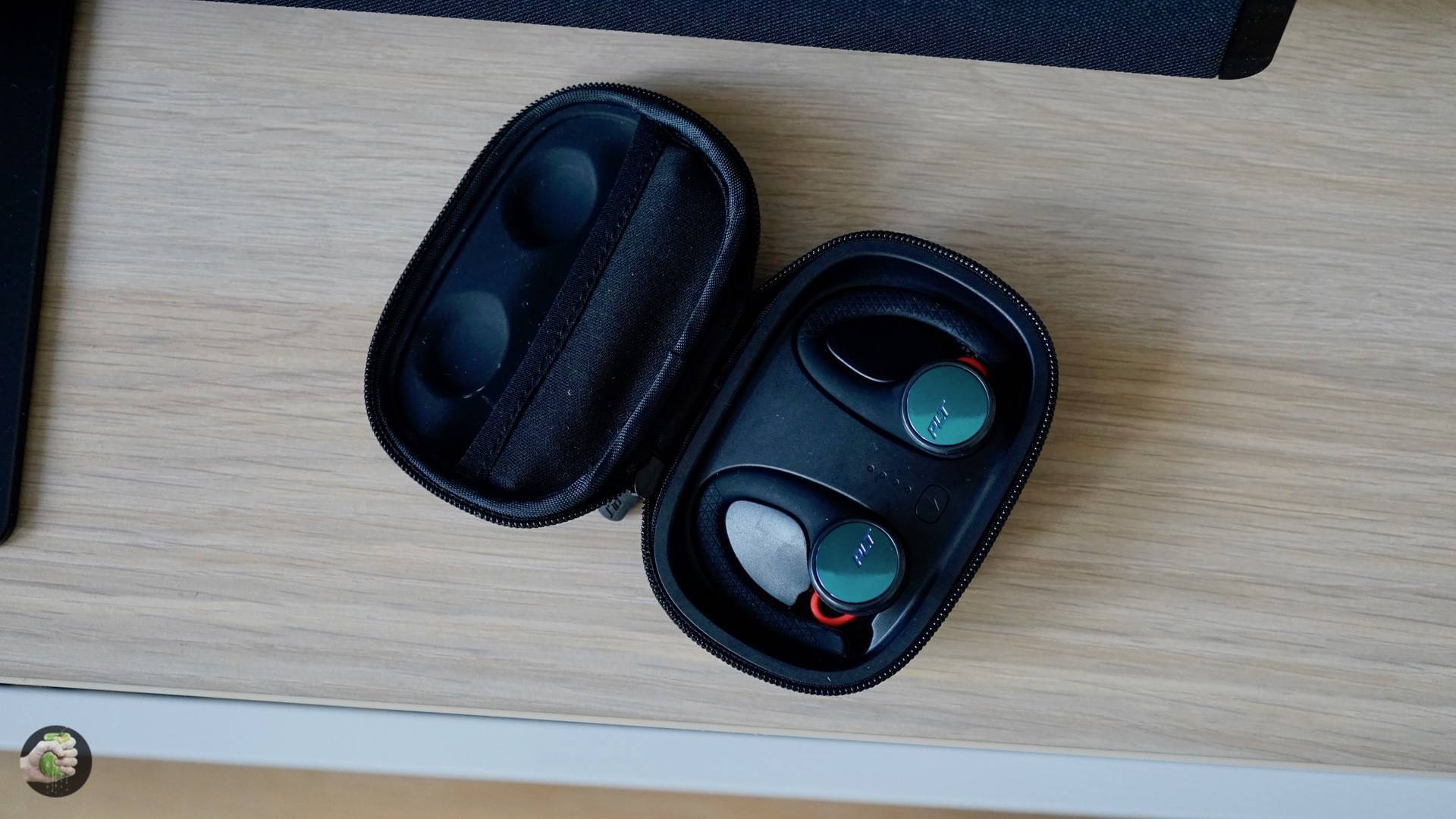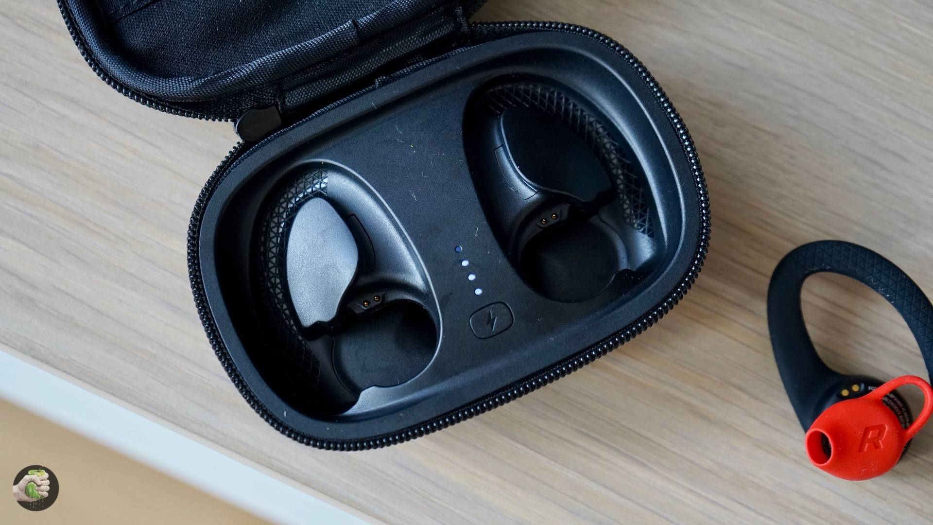 Пусть вас не пугают массивные дужки: они сделаны из мягкой резины и практически не ощущаются на ухе. Красные насадки тоже мягкие. Вообще, тут всё сделано для того, чтобы с вашим телом соприкасалась только резина — никаких помех для спорта или других активных занятий. Зарядный кейс довольно большой, можно было заменить странный материал снаружи на пластик, но ладно, простим.