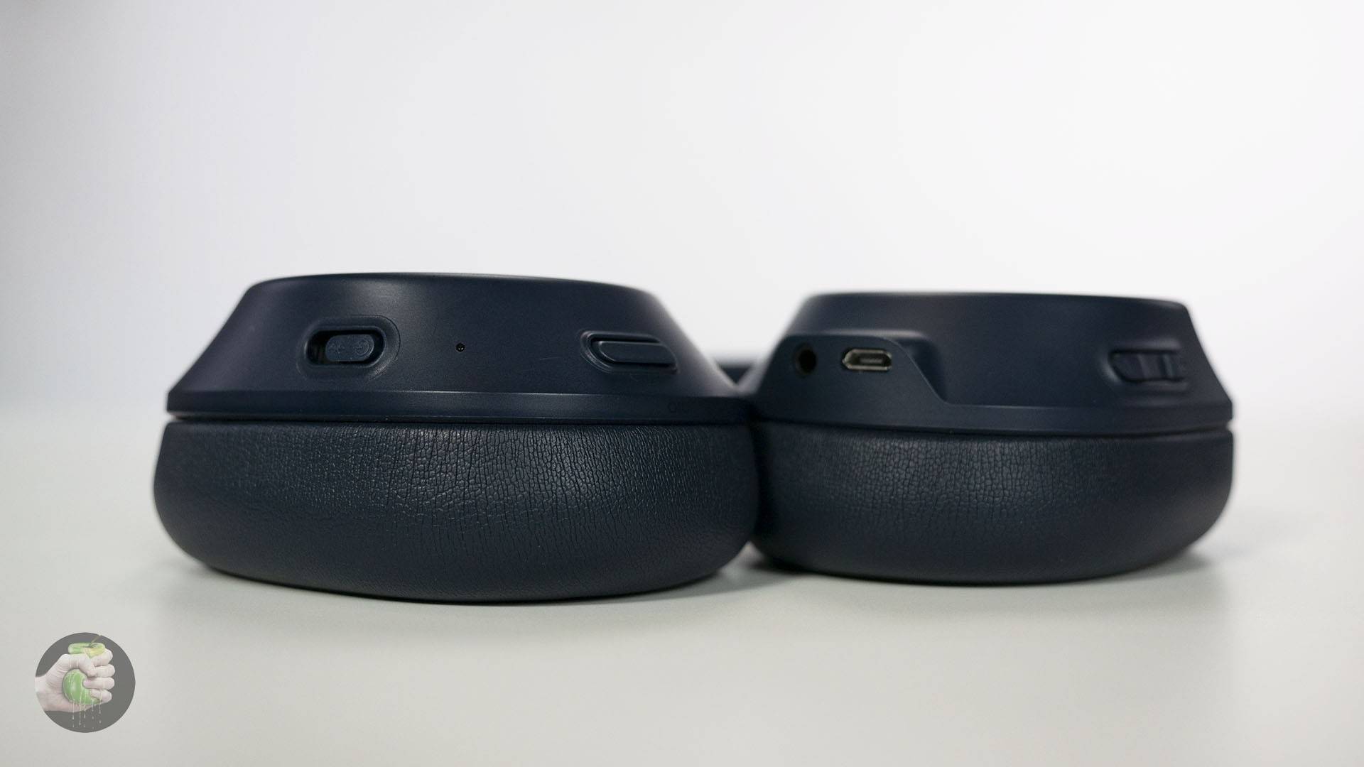 На левом «ухе» аж пять кнопок: «вперед», «назад», «пауза» и качелька громкости. Кнопки для переключения треков расположены на тыльной стороне чашки, вначале было неудобно нажимать прямо на корпус наушников — легко не рассчитать усилия и вдавить амбушюр в ухо. Но привыкнуть можно, к тому же кнопки громкости находятся на привычном месте — ребре чашки. Здесь же, на левой стороне, расположены все разъемы — micro USB и аудиовход 3,5 мм.