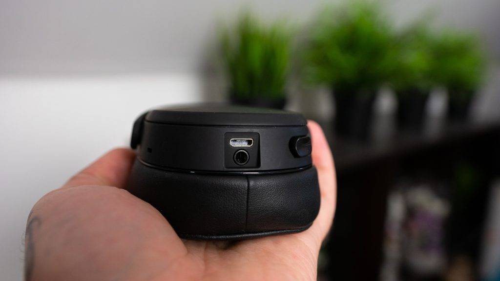 On the bottom of the left ear cup are a 3.5mm input and a microUSB charging port.