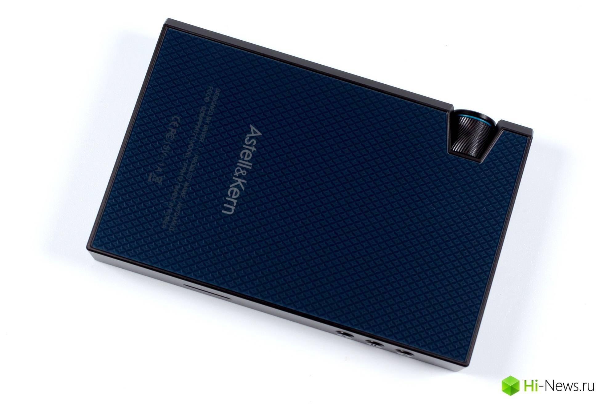 Задняя панель плеера покрыта пластиком с интересным тёмно-синим узором, не карбон, конечно, но всё равно выглядит эффектно. Большую часть передней панели занимает сенсорный экран, он очень хорош по всем параметрам: цветопередача, углы обзора, разрешение и даже запас по яркости позволяет дисплею не совсем слепнуть на солнце. Под экраном, как обычно у A&K, находится сенсорная кнопка возврата обратно.