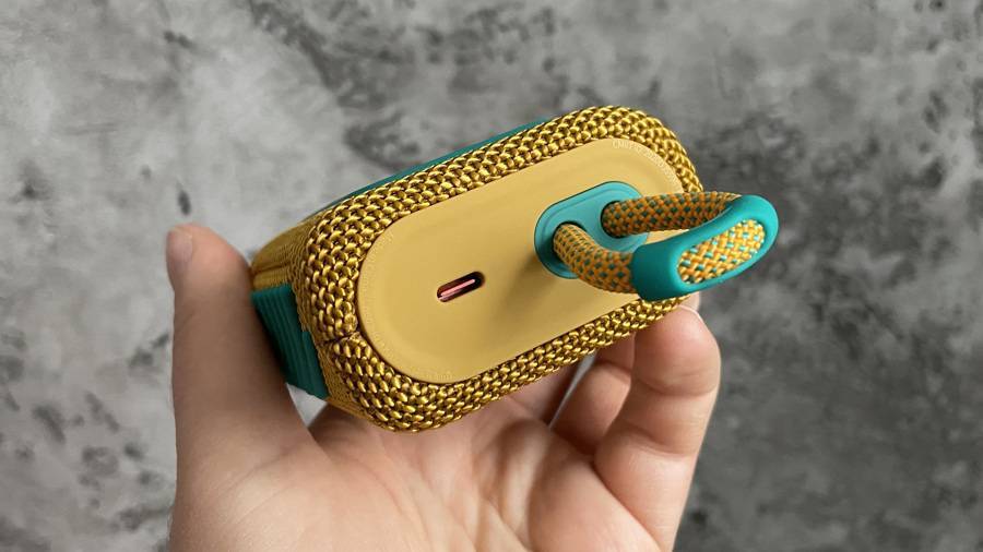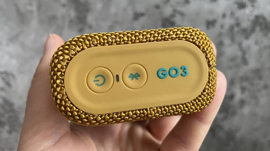 К нам на тест привезли колонку желтого цвета, хотя чисто субъективно это, скорее, один из его оттенков — “горчичный” или более модный вариант — “лимонный карри”. Логотип JBL по-прежнему занимает почти всю переднюю панель нового гаджета, где в отличие, например, от JBL Go 2 на смену перфорированному металлу пришла акустическая ткань.