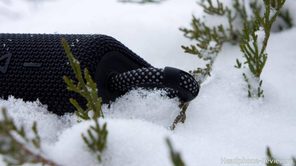 Тем не менее, новая портативная колонка все еще умещается в кармане джинсов и вполне комфортно лежит в ладони, где может фиксироваться пальцем в петлевой ручке.