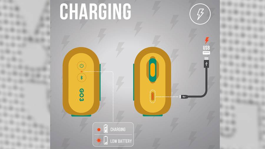 Истощение встроенного аккумулятора у JBL Go 3 сопровождается красным мерцанием светодиодного индикатора, в то время как во время зарядки он светится красным цветом постоянно. Встроенная батарея подключается к источнику заряда (в качестве которого подойдет сетевой адаптер практически от любого смартфона или планшета) входящим в комплект кабелем через разъем USB Type-C на корпусе JBL Go 3.