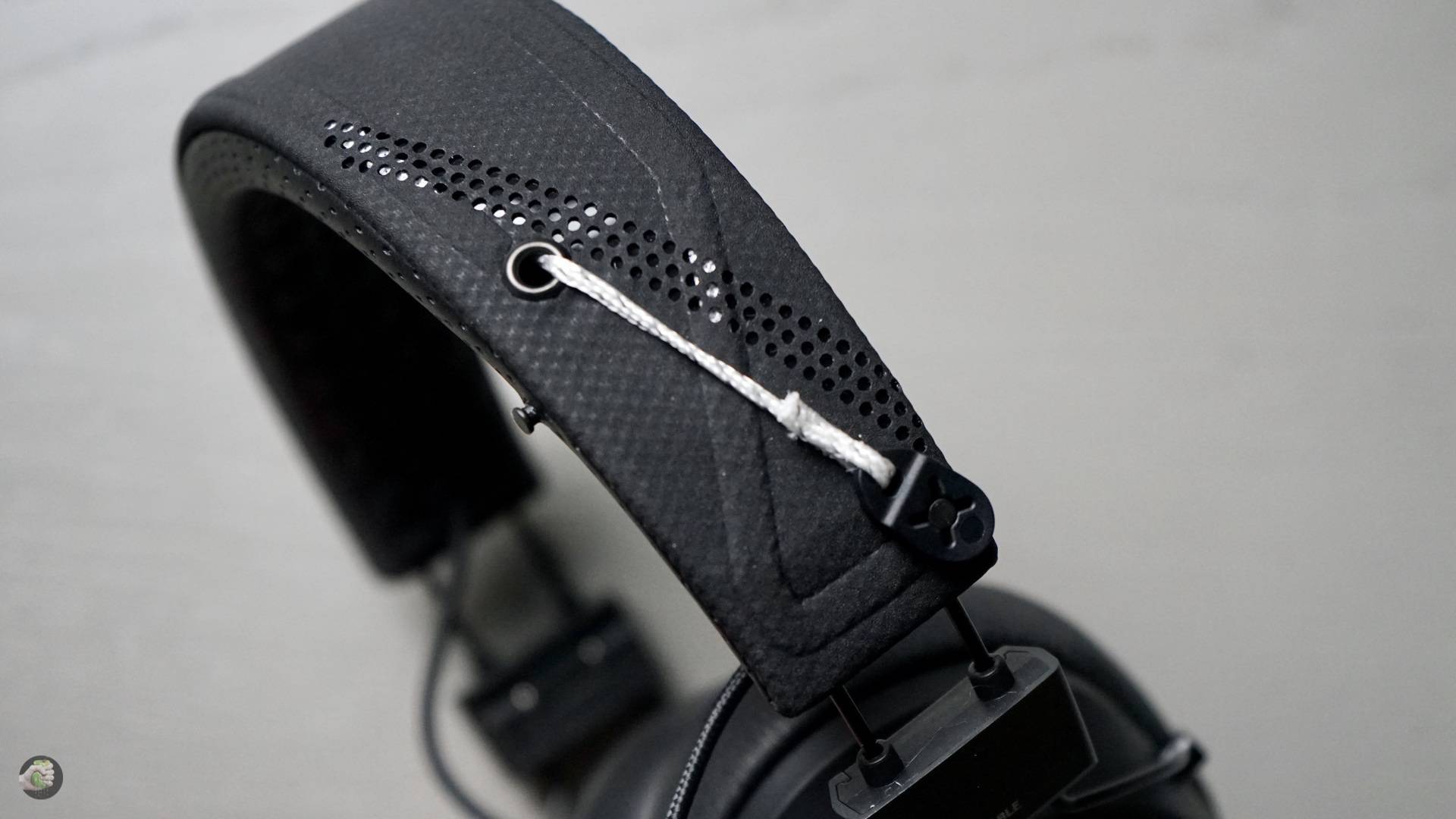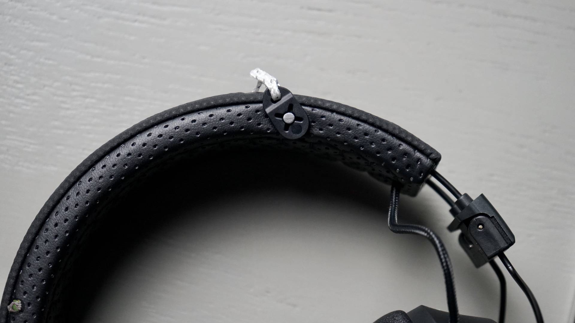 Впервые вижу в наушниках такого типа стяжку, способную чуть изменить размер оголовья: это верёвочка слева, вытяните её и закрепите на шпеньке. Если не понимаете, зачем оно нужно — значит, наушники у вас сели как положено и никаких проблем нет. Если оголовье кажется слишком свободным — затяните его! К слову, тут два шпенька, один находится на боку, так что если с оголовьем не всё гладко, попробуйте поэкспериментировать.