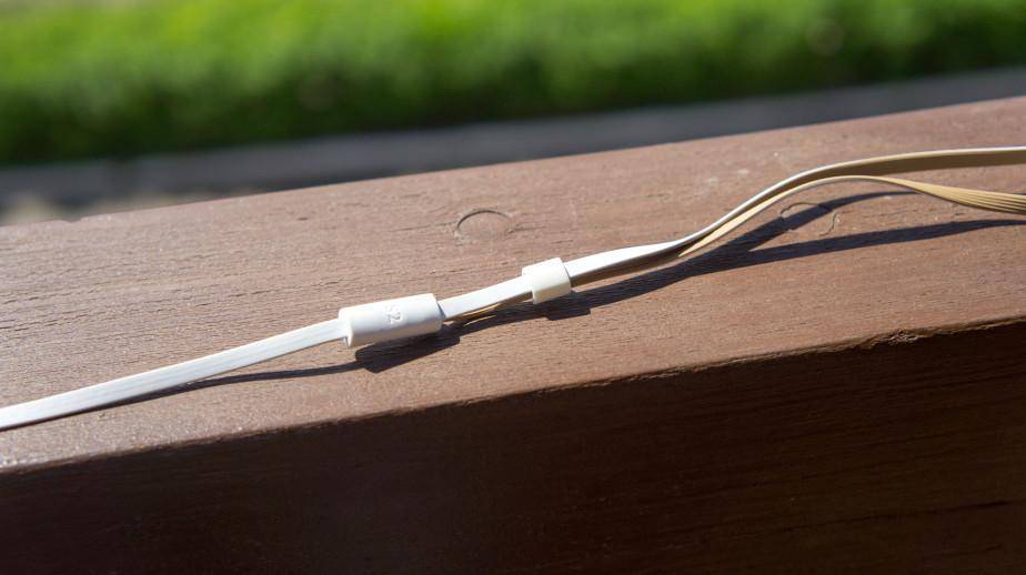Провод типа «лапша» — плоский и гибкий, приятный на ощупь, прорезиненный и совершенно не путающийся, в какой бы клубок вы наушники не скрутили. Его длина составляет 1,2 м.