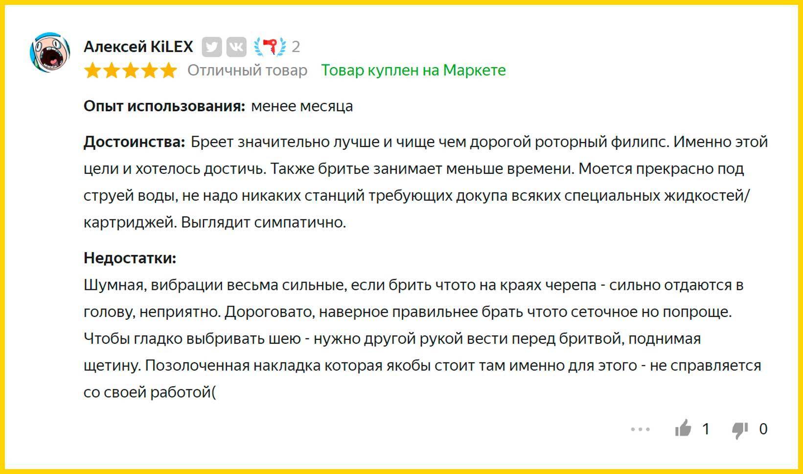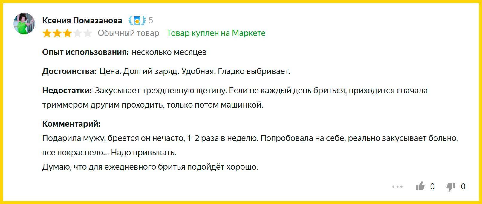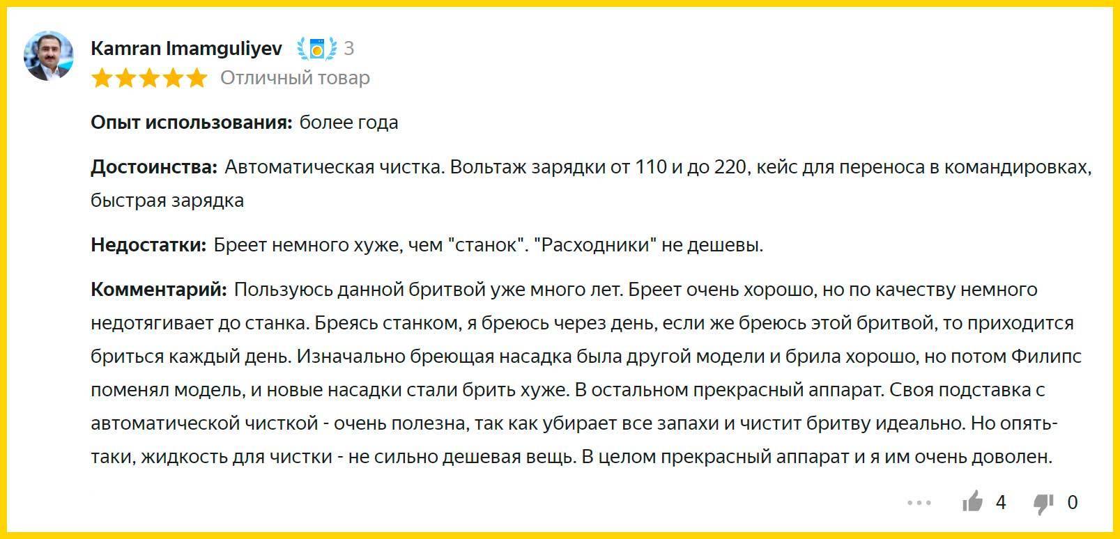 Покупателям нравится качество бритья, тихая работа, наличие триммера в комплекте. Питание бритвы исключительно автономное, работа от сети не предусмотрена, что в некоторых случаях не совсем удобно.
