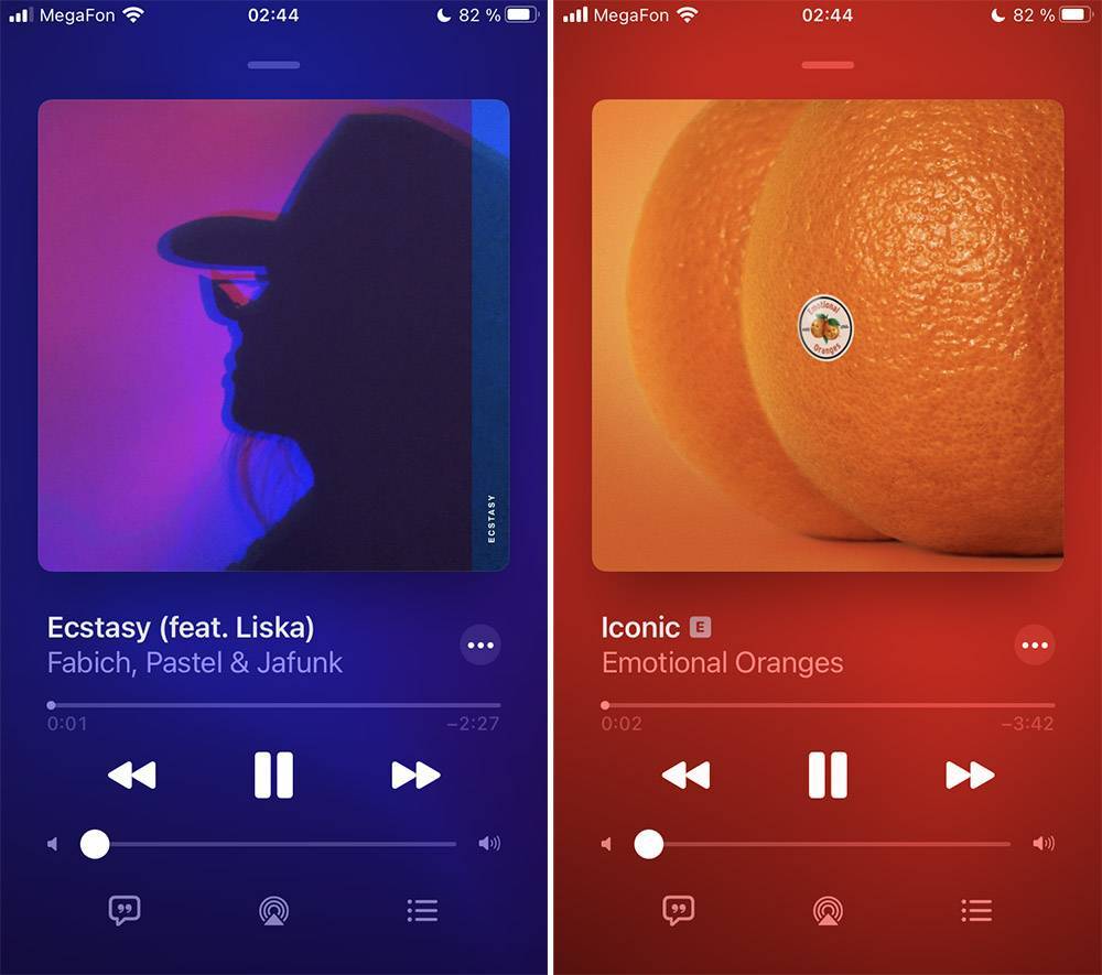 Многим понравился «баг» музыкального плеера iOS 13: цветной фон режима Текст, отображающийся на основной странице воспроизведения. Apple он тоже понравился, поэтому в iOS 14 такой фон используется по умолчанию. Он подстраивается под цвета обложки альбома и переливается, наполняя ранее строгий плеер сочными оттенками.