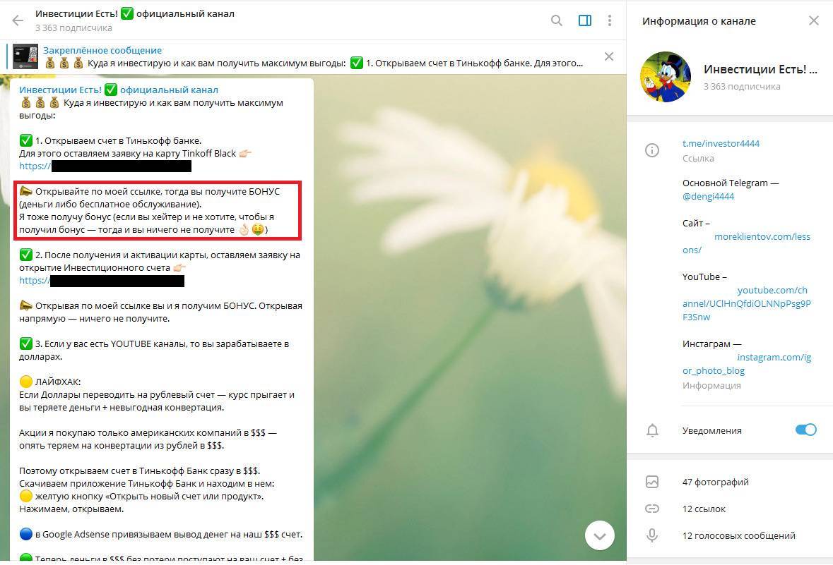 Более активные сообщества Игорь использует для продвижения партнерских программ. Если внимательно изучить содержание постов, то окажется, что у проекта «Деньги Есть!» минимум полезного контента. На основном телеграм-канале Чередников пытается увеличить аудиторию за счет конкурса с розыгрышем ноутбука. А на втором рекламирует услуги банка Tinkoff и сервиса «Толока».