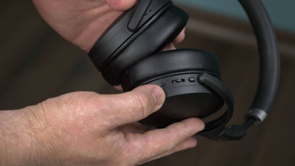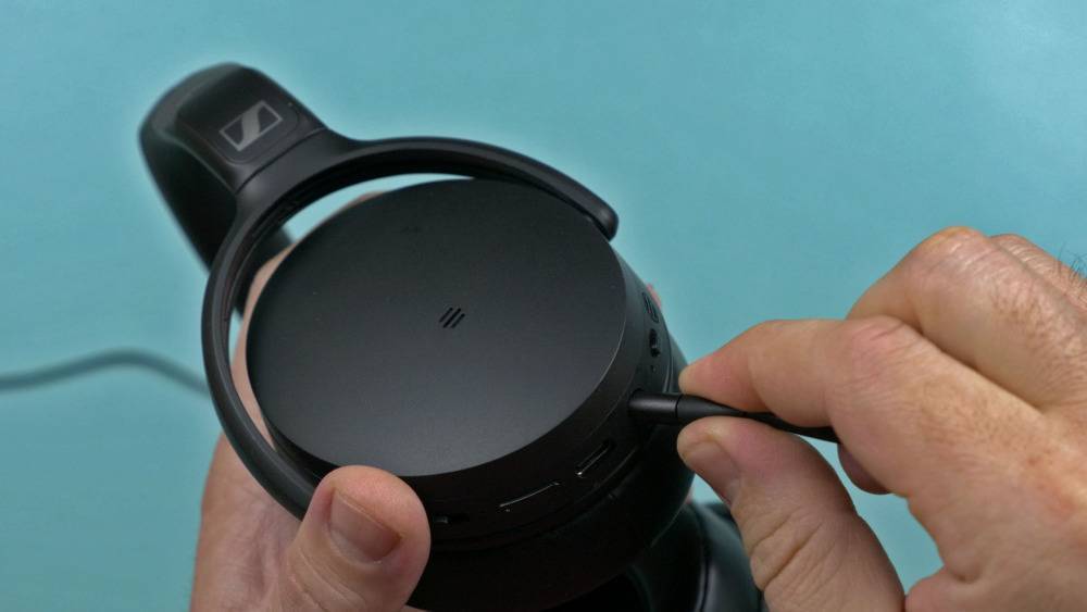 Тут же на правой чашке есть два микрофона, разъем Type-С для зарядки и выход для аудиокабеля. С ним Sennheiser тоже немного намудрили, в корпус он не просто подключается, а еще и фиксируется по специальной резьбе. Вроде бы и забота о том, чтобы он случайно не отключился, но мы сначала не могли понять, что со звуком, оказалось что кабель не был вставлен до конца. А потом парочку раз чуть его не вырвали со всем содержимым. В общем технология конечно антинародная.
