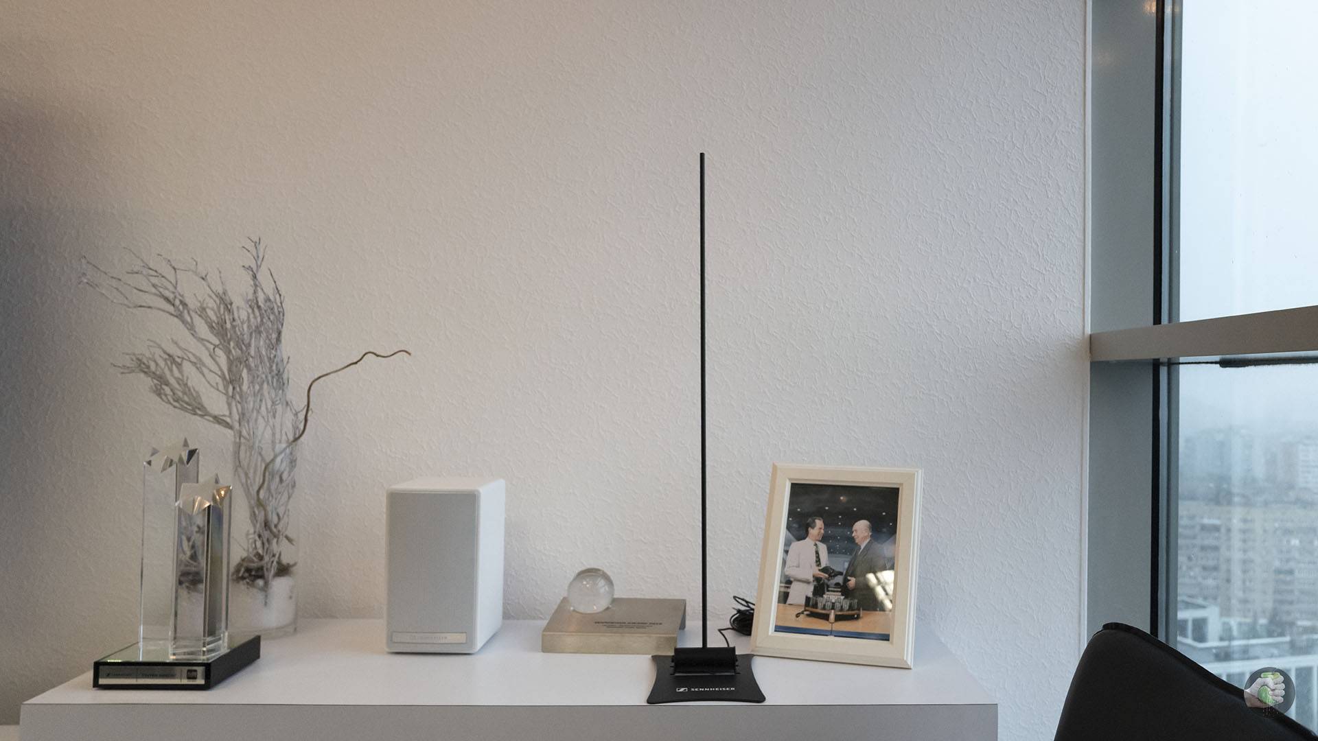 Вместе с Ambeo Soundbar в комплекте идёт специальный калибровочный микрофон. Его нужно поставить в то место, где будут сидеть зрители. Например, на диван.