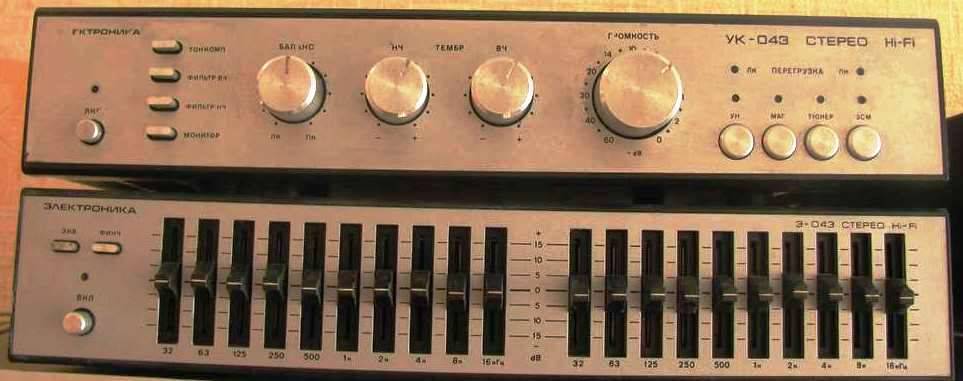 Конечно его не сравнить со таким красивым усилителем как Электроника УК-043 стерео Hi-Fi, у последнего передняя панель из алюминия, хоть корпус по толщине тоньше, но из металла. Кстати, в комплект к этому усилителю входил также эквалайзер «Электроника Э-043 стерео Hi-Fi».