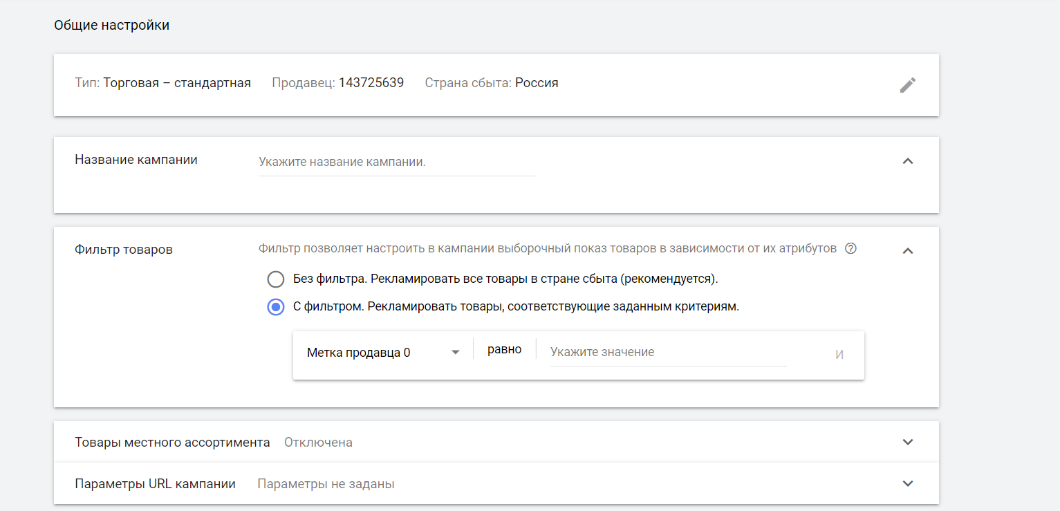 После добавления меток к фиду нужно указать значение в фильтре, выбрав нужный custom_label, а затем заполнить остальные настройки. Теперь торговая кампания готова.