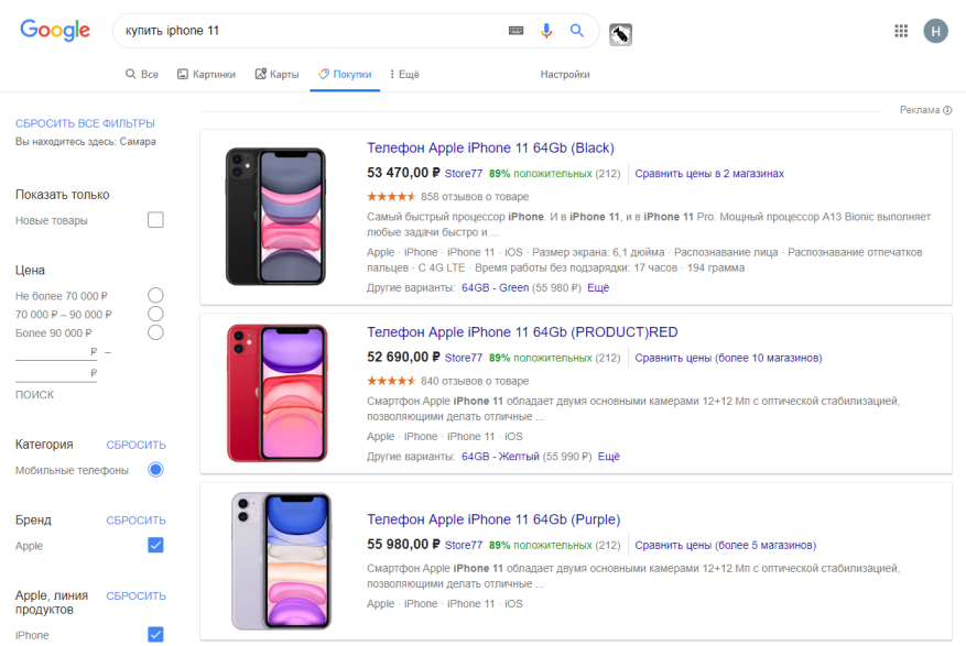 “Google Покупки” – сервис Google, позволяющий продавать товары в розницу прямо в поисковике. Каталог аналогичен “Яндекс.Маркету”, однако функционал его шире. Рекламные объявления выглядят так: