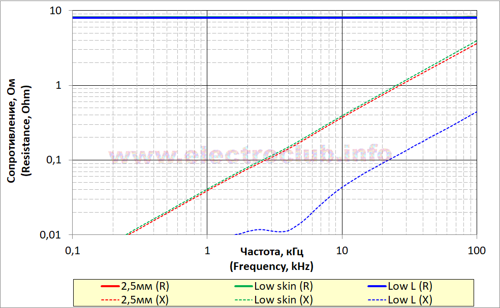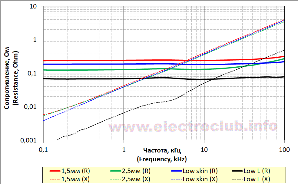 Для большей наглядности я нормировал графики параметров каждого из кабелей к активному сопротивлению этого кабеля на частоте 100 Гц. То есть все дальнейшие графики показывают, как изменяется сопротивление каждого из кабелей по отношению к его активному сопротивлению R на частоте 100 Гц. Тогда их можно корректно сравнивать. В этом случае на результаты не влияет ни длина кабеля, ни его сечение. Только конструкция.