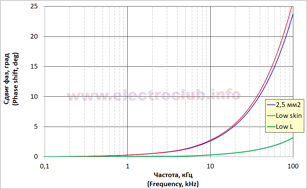Фазочастотная характеристика системы кабель + нагрузка показана на рисунке 15. Как видите, на частоте 20 кГц сдвиг фаз составляет 5 градусов. На нагрузке 4 ома фазовый сдвиг будет равен 10 градусов. На слух это тоже незаметно.