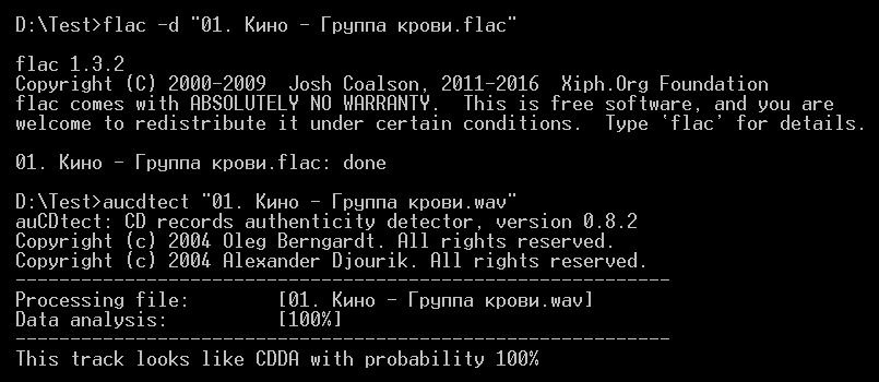 Скачать auCDtect можно тут. Эта консольная программа работает только с WAV-файлами, поэтому проверяемый материал необходимо предварительно вручную декодировать в этот формат при помощи соответствующего кодека. Те, кого в принципе смущает интерфейс командной строки, могут сразу перейти к следующему пункту, для остальных приведу пример работы с программой. Проверим FLAC-файл, который находится в папке D:\Test. Положим в эту папку файлы flac.exe (кодек FLAC) и aucdtect.exe, которые и будем запускать. Процедура проходит в два шага: сначала командой декодируем FLAC-файл в WAV, затем командой запускаем проверку полученного WAV-файла в auCDtect: