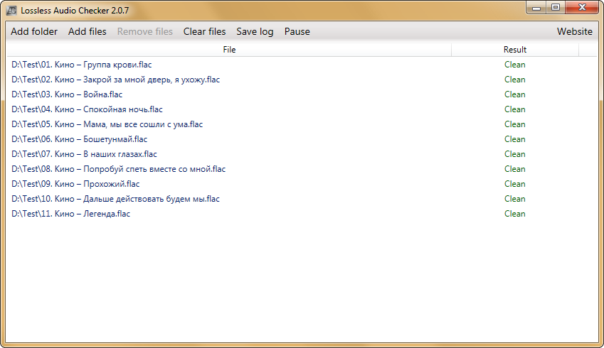 Название данной программы похоже на название предыдущей, но не нужно их путать — это совершенно разные продукты. Lossless Audio Checker доступен для скачивания на оригинальном сайте, имеются графическая и консольная версии. Интерфейс программы минималистичен, какие-либо настройки отсутствуют. По результатам проверки полноценный lossless отмечается как «Clean», фейковый — «Upsampled»: